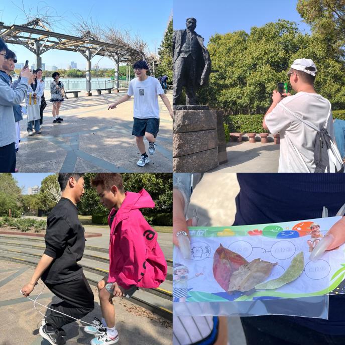 活动当天,微风轻拂,阳光明媚,同学们早早的便来到了黄兴公园,满怀期待地开启了这场奇特的心灵探索之旅。在市民认养林,同学们俯身探寻,精心收集 3 种不同形状的落叶,于自然中感受生命的多样与美好;在亲水长廊处,同学们完成100次跳短绳的任务,现场加油声、欢笑声交织,氛围热烈;在黄兴铜像前,同学们庄重地与黄兴雕像合影,缅怀先烈,传承爱国精神;在扇形大草坪上,大家用英语表达积极向上的语句,从励志名言到对美好生活的憧憬,一句句充满正能量的话语,将专业学习与实践活动有机结合。最终,同学们汇聚在公园中心广场,集齐 6 枚印章的同学获得抽奖资格,为同学们带来了意外的惊喜,进一步调节了情绪,释放了心理压力。